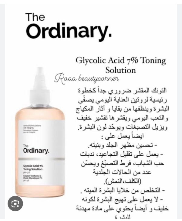 امنح بشرتك إشراقة صحية ونضارة متجددة مع تونر The Ordinary بحمض الجليكوليك 7%، الحل المثالي لتقشير البشرة بلطف وتحسين ملمسها وتوحيد لونها.